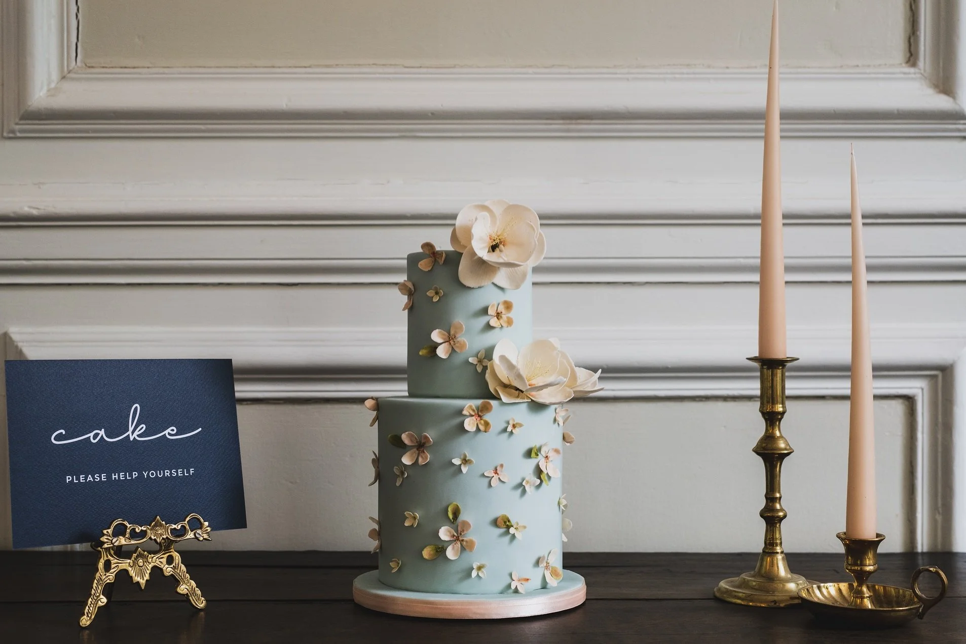 Pale mint single tier with hand crafted sugar apple blossoms and gold leaf detail.