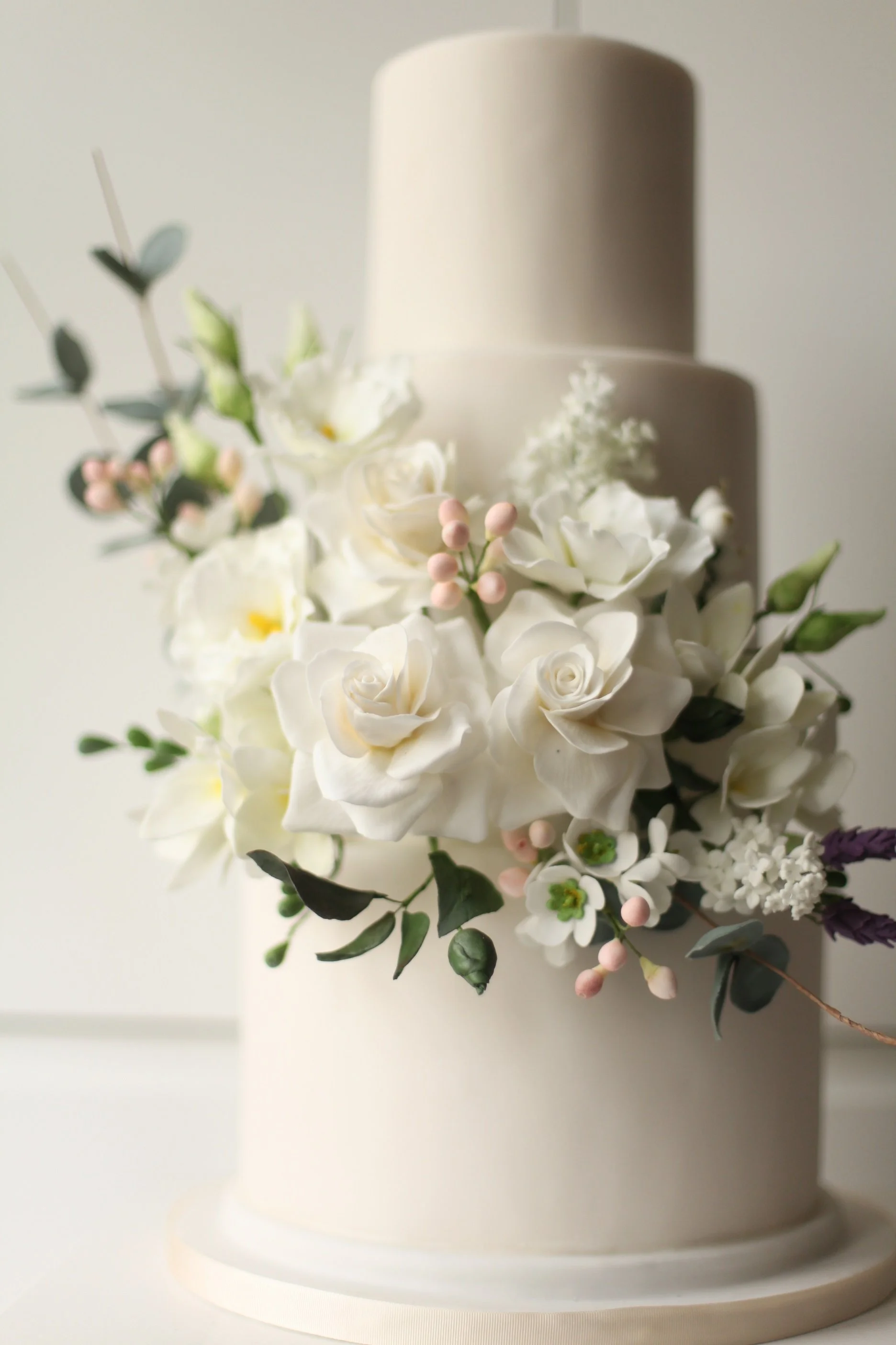 White hot summer in cake form. Beautiful romantic sugar bouquet of tonal whites, foliage and pale pink berries.