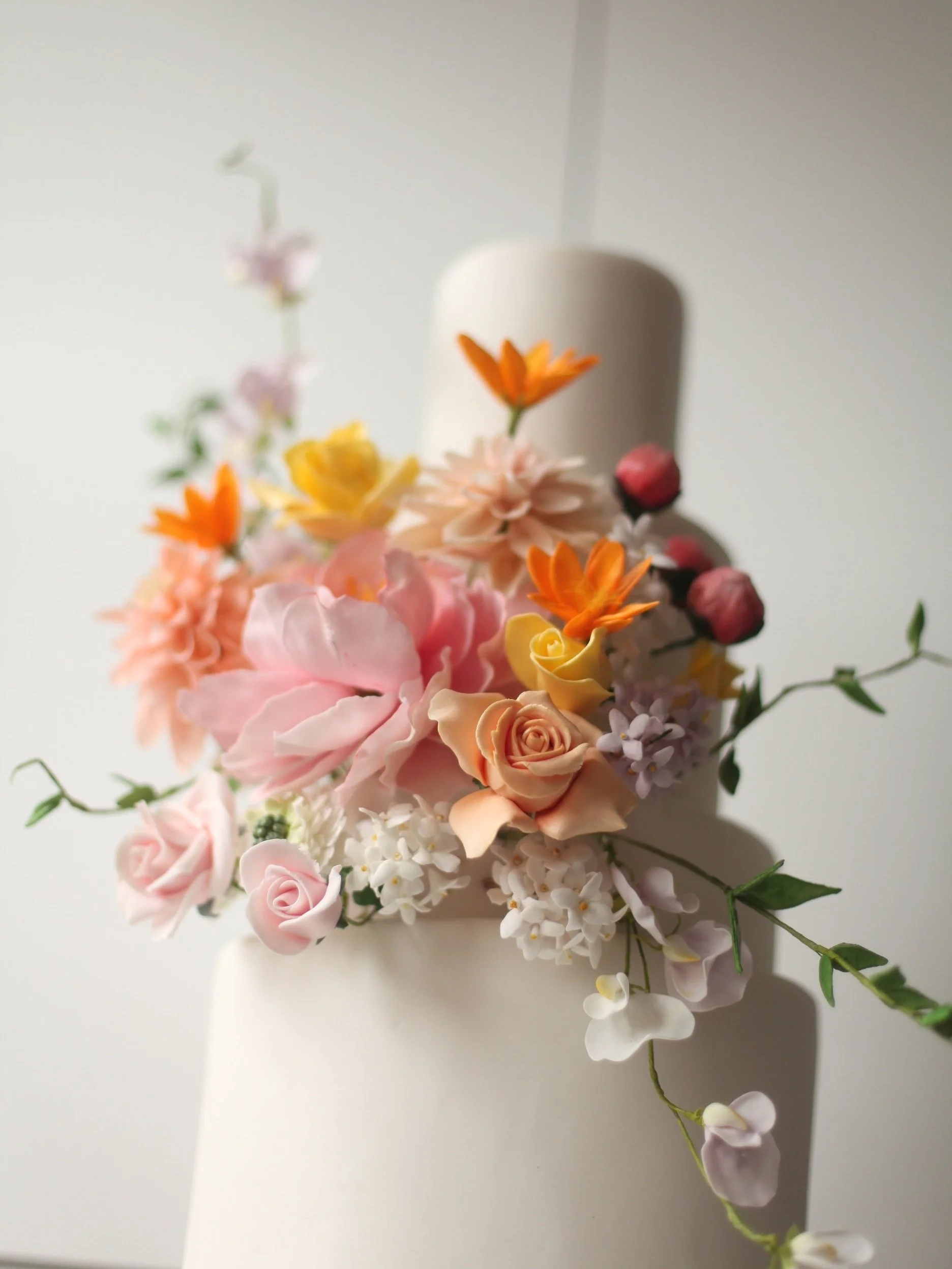 You cannot ever underestimate white for a wedding or wedding cake design at any time of year, and definitely summer - tonal whites mixed with seasonal pastels makes for a beautiful and elegant cake. White roses, peony, scabious, anemone, dahlia, carnation, ranunculus - the options are endless for your sugar bouquet. Team with tonal green foliage or pale berries for contrast.