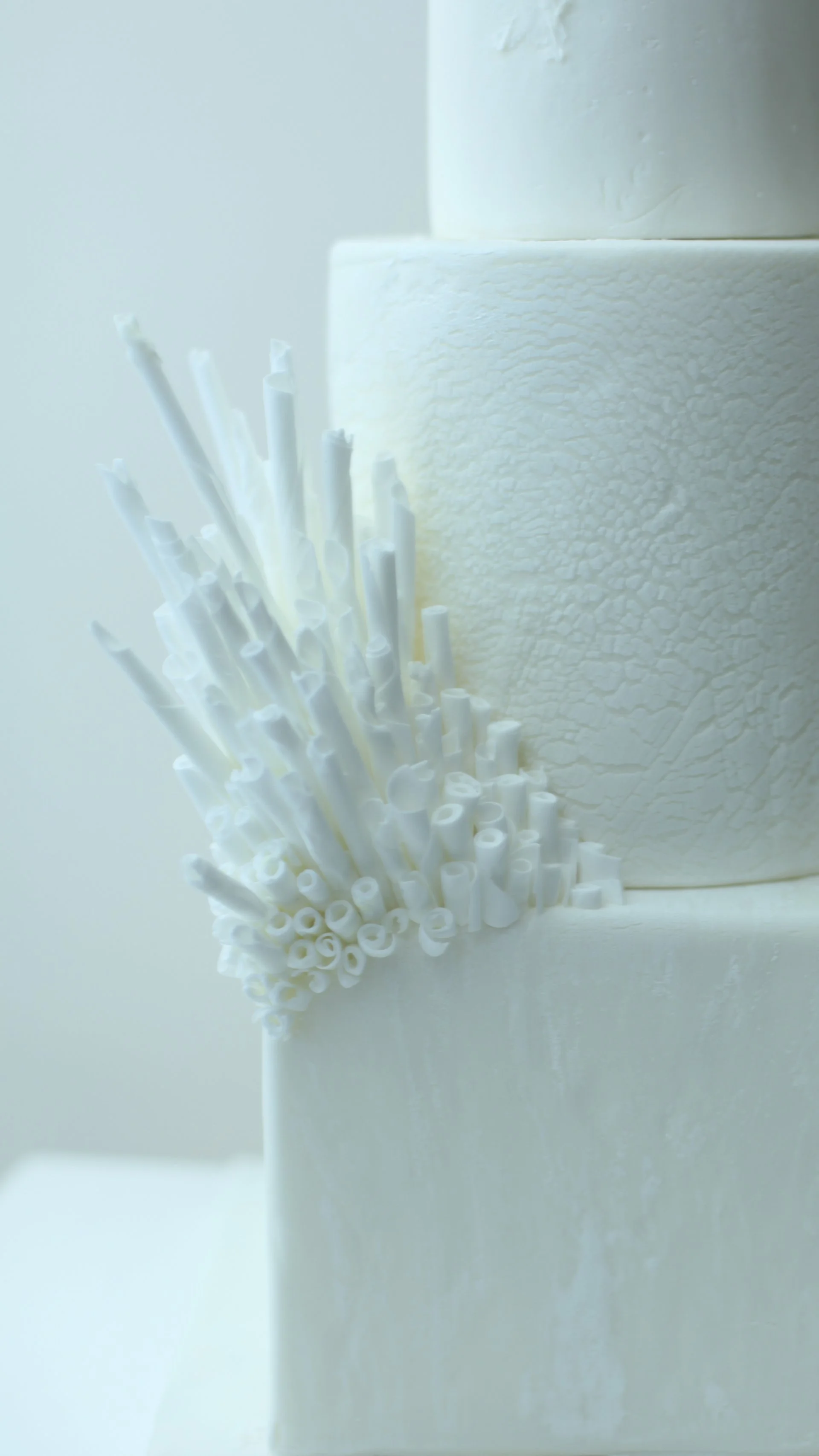 Minimal white wedding cake with sugar sculptural elements